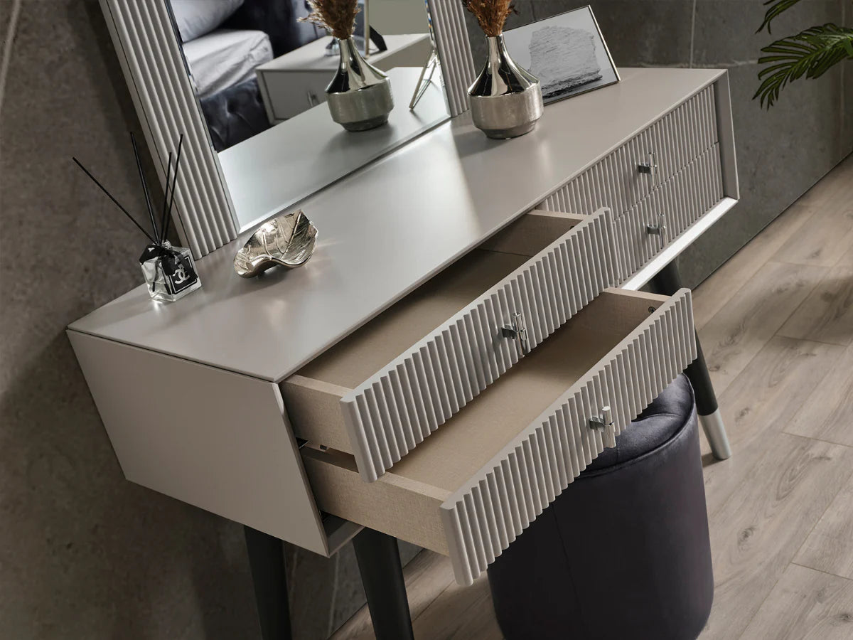 Açelya Yatak Odası, ön yüzeylerinde CNC işlemi ile özenle tasarlanmış detaylara sahiptir. Bu detaylar, yatak odasına zarif bir hava katarak görsel açıdan zengin bir atmosfer yaratır.