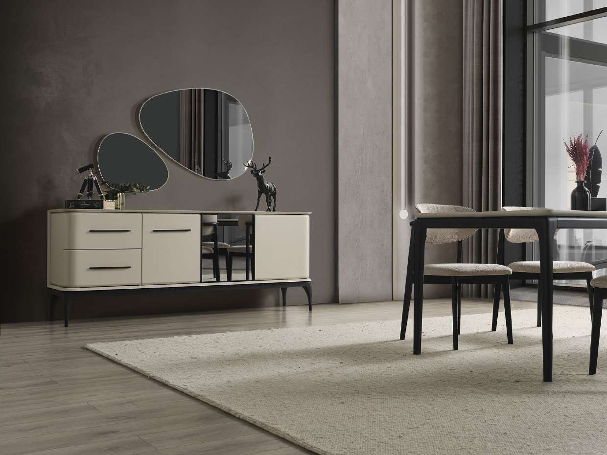Destan Yemek Odası ile hayalinizdeki yatak odasını oluşturun. Bu zarif Destan Yemek Odası, şık tasarımı ve fonksiyonel özellikleriyle evinize estetik bir dokunuş getiriyor. Destan Yemek Odası, 1 adet dolap, 1 adet şifoniyer, 1 adet şifoniyer aynası, 1 adet karyola ve başlık, 2 adet komodinden oluşur.