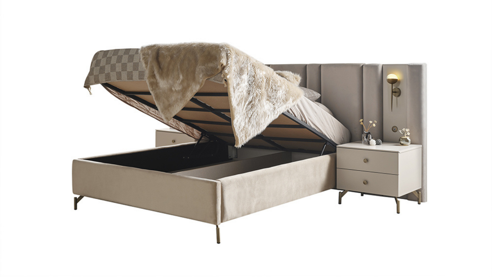 Eva Yatak Odası'nın baza fonksiyonu sandık bazalıdır. Çelikten üretilen baza, yatak odasında kullanışlı depolama alanları sunarak düzeni korumanıza yardımcı olur.