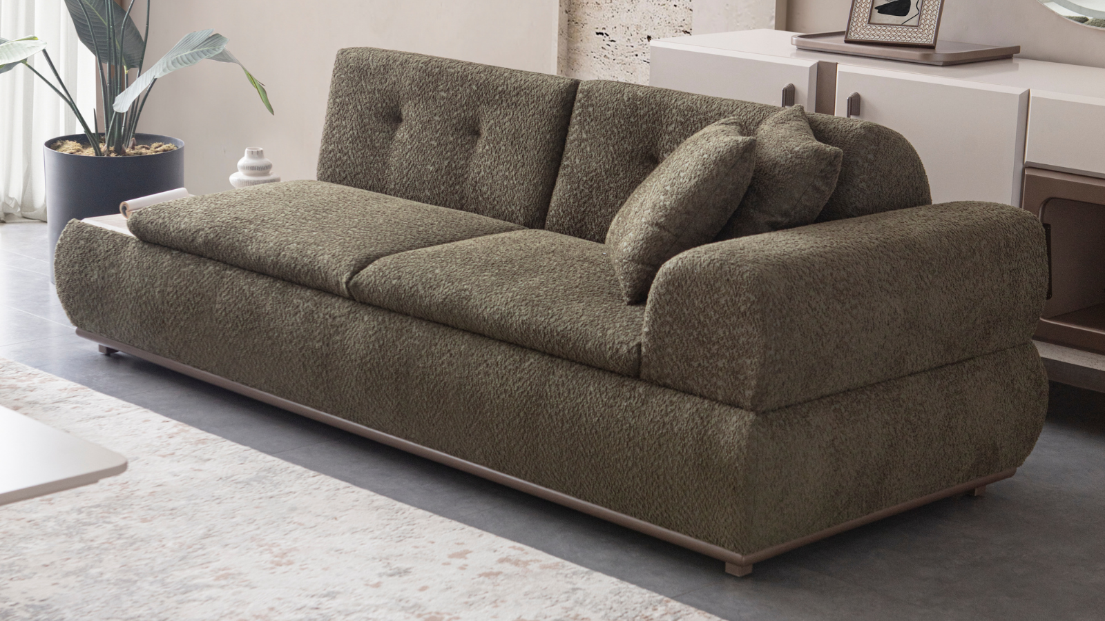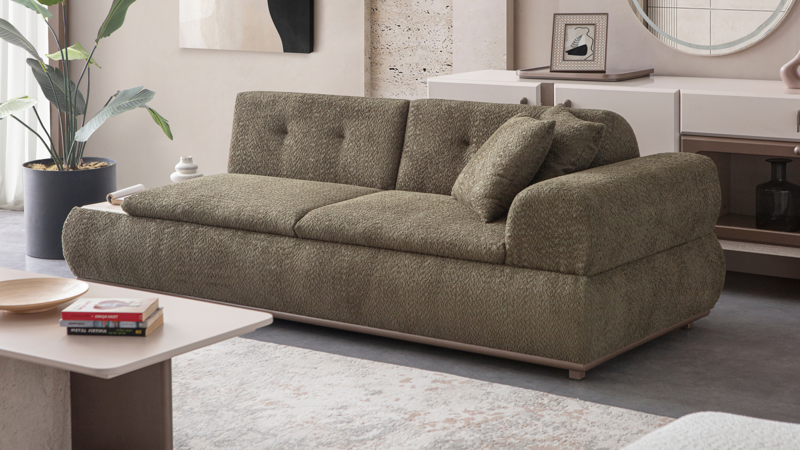 Gloria Koltuk Takımı, zarif tasarımı ve fonksiyonel özellikleriyle dikkat çekiyor. Yatak olma özelliği sayesinde konuklarınıza rahat bir uyku alanı sunarken, silinebilir kumaş özelliğiyle temizliği kolay ve pratik bir şekilde gerçekleştirebilirsiniz.