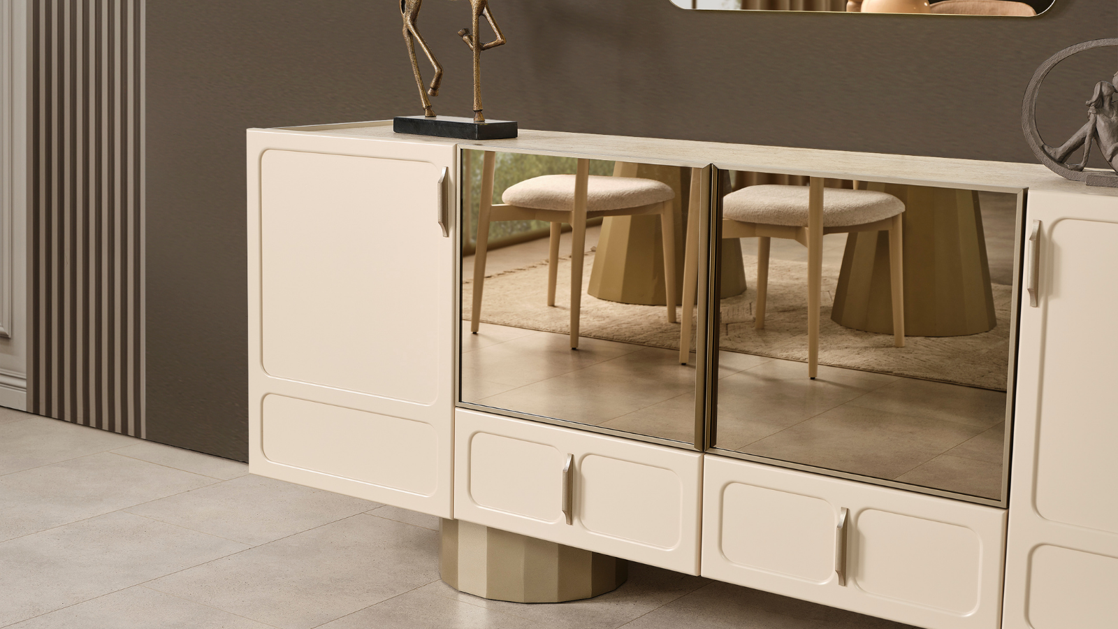 Miran Yemek Odası ile hayalinizdeki yatak odasını oluşturun. Bu zarif miran yatak odası takımı, şık tasarımı ve fonksiyonel özellikleriyle evinize estetik bir dokunuş getiriyor. Miran Yemek Odası, 1 adet dolap, 1 adet şifoniyer, 1 adet şifoniyer aynası, 1 adet karyola ve başlık, 2 adet komodinden oluşur.