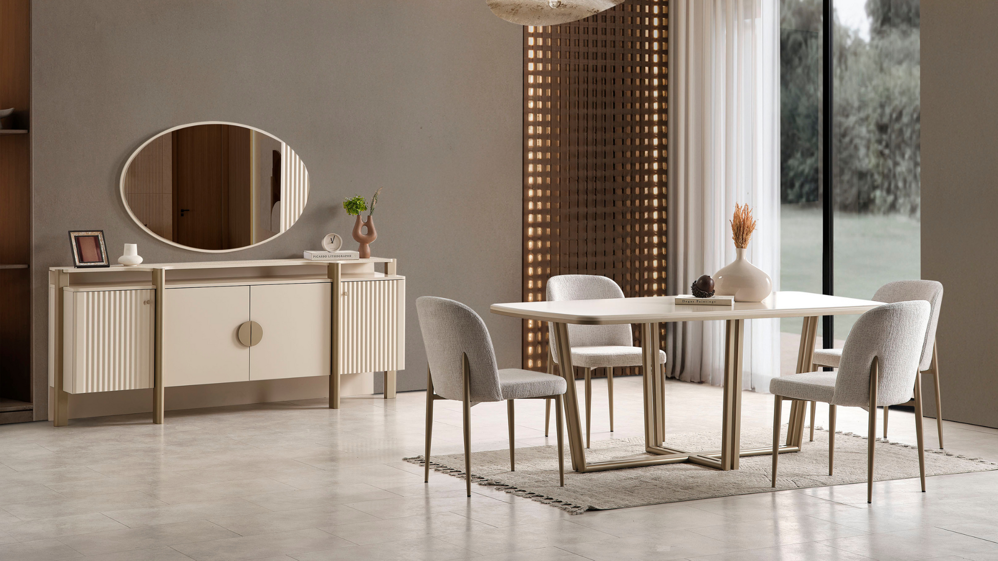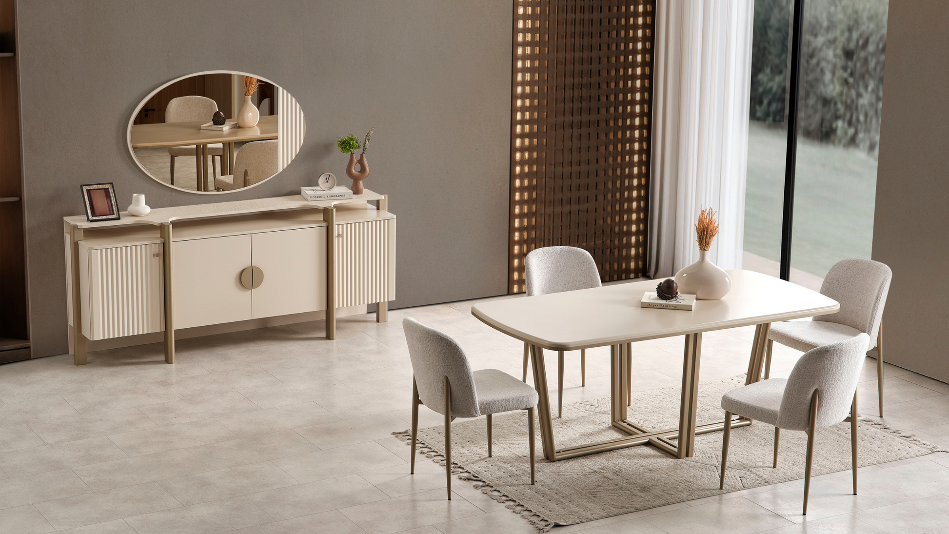 Zirve Yemek Odası ile hayalinizdeki yatak odasını oluşturun. Bu Zirve Yemek Odası takımı, şık tasarımı ve fonksiyonel özellikleriyle evinize estetik bir dokunuş getiriyor.